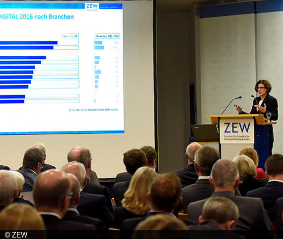 Prof. Dr. Irene Bertschek, Leiterin des ZEW-Forschungsbereichs "Informations- und Kommunikationstechnologien" (IKT), legte dar, weshalb vielfach auf den digitalen Wandel zur Lösung des Produktivitätsproblems gesetzt werde. "Unumstritten ist, dass Digitalisierung ein Produktivitätstreiber ist", sagte Bertschek, "aber es gibt Unterschiede innerhalb und zwischen verschiedenen Branchen, je nach eingesetzter Technologie und getätigten Investitionen." So gebe es in allen Branchen nach wie vor Unternehmen, die ihren Beschäftigten keine mobile Internetnutzung zur Verfügung stellten. Zugleich zeige sich, dass IKT-Investitionen maßgeblich zum Produktivitätswachstum beitrügen. "Die Technologie allein reicht allerdings nicht aus", so Bertschek, "es kommt auch darauf an, dass Beschäftigte weitergebildet werden und in Forschung und Entwicklung investiert wird." Vor allem komplementäre, immaterielle Investitionen spielten dabei ein wesentliche Rolle.