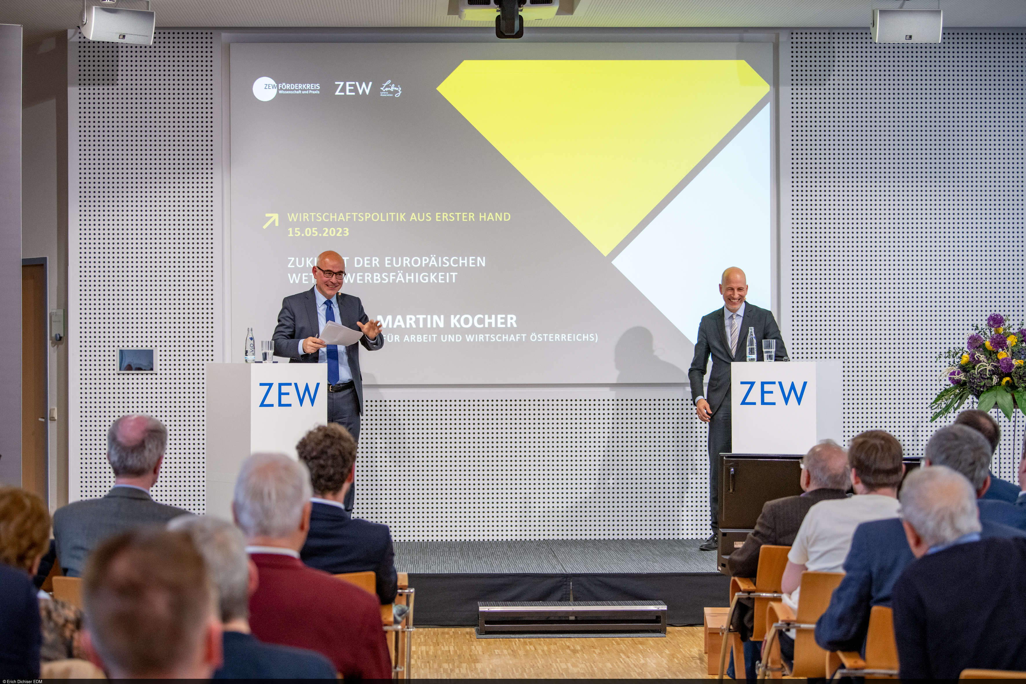 Zur Begrüßung sagte ZEW-Präsident Achim Wambach, PhD, Martin Kocher sei ein Superminister, da er Arbeits- und Wirtschaftsminister zugleich ist, und habe eine beachtliche wissenschaftliche Vita vorzuweisen, die sehr gut zum ZEW passe. Diese Expertise brachte Kocher in seinen Vortrag ein, in dem er die wirtschaftliche Entwicklung skizzierte: „Österreich als Land mit relativ hoher Kaufkraft hatte 2020 einen stärkeren Einbruch als der europäische Durchschnitt. 2022 war ein Jahr, das durch starkes Aufholen mit knapp 5 Prozent Wirtschaftswachstum geprägt war.“ Den Prognosen nach tue sich 2023 weniger mit 0,4 bis 0,5 Prozent; damit liege das Wachstum im EU-Durchschnitt.