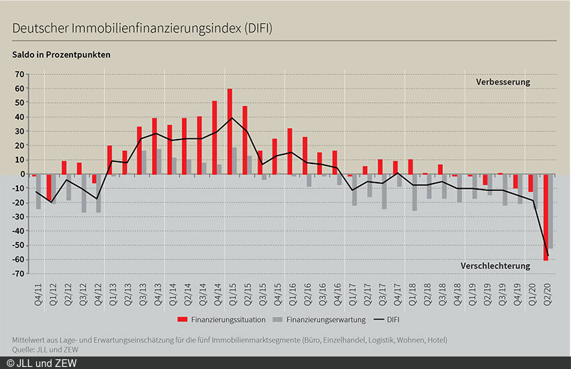 Der Deutsche Immobilienfinanzierungsindex (DIFI) bildet die Einschätzungen der aktuellen Geschäftslage (vergangene sechs Monate) und der Geschäftserwartungen (kommende sechs Monate) bezüglich der deutschen Immobilienfinanzierungsmärkte ab. Er wird quartalsweise ermittelt und berechnet sich als Mittelwert der Salden für die Immobilienmarktsegmente Büro, Einzelhandel, Logistik, Wohnen und Hotel. Die Salden für die Segmente ergeben sich aus den prozentualen positiven und negativen Antworten der Umfrageteilnehmerinnen und Umfrageteilnehmer auf die Frage nach der Lage und der Erwartung für den deutschen Immobilienfinanzierungsmarkt. Der DIFI wird in Kooperation von Jones Lang LaSalle (JLL) und dem ZEW – Leibniz-Zentrum für Europäische Wirtschaftsforschung erhoben und veröffentlicht. An der Umfrage vom 4. bis 18 Mai 2020 beteiligten sich 27 Expertinnen und Experten.