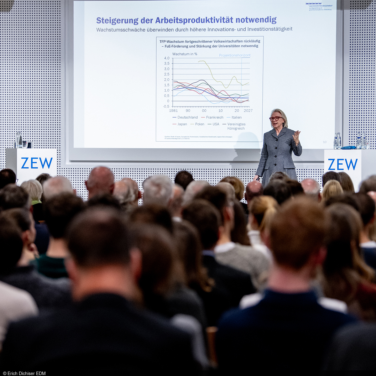 Das Wachstum der deutschen Wirtschaft ist gehemmt – durch die demographische Alterung, das geringe Produktivitätswachstum, den veralteten Kapitalstock sowie die geringe Anzahl junger und innovativer Unternehmen. In seinem Jahresgutachten identifiziert der Sachverständigenrat die drängendsten wirtschaftspolitischen Herausforderungen und benennt Maßnahmen zu deren Bewältigung. Einen fundierten Einblick in die Empfehlungen gab Prof. Dr. Dr. h.c. Monika Schnitzer, Vorsitzende der Wirtschaftsweisen, im Austausch mit ZEW-Präsident Prof. Achim Wambach am 4. Dezember 2023 im Rahmen der ZEW-Veranstaltungsreihe „Wirtschaftspolitik aus erster Hand“ in Mannheim.
