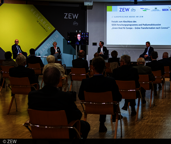 Der europäische Green Deal ist ambitionierter Klimaschutzplan der EU, dessen Umsetzung einige Fragen offen lässt. Was es braucht, damit Europa bis zum Jahr 2050 klimaneutral wird, darüber diskutierten beim Europäischen Abend am ZEW Mannheim die baden-württembergische Wissenschaftsministerin Theresia Bauer, der ehemalige EU-Kommissar Günther H. Oettinger sowie Ottmar Edenhofer, Direktor des Potsdam-Instituts für Klimafolgenabschätzung, und ZEW-Präsident Achim Wambach. Corona-bedingt war nur ein exklusiver Teilnehmerkreis von 30 Gästen vor Ort zugelassen. Aber alle Interessierten konnten den Festakt zum Abschluss des SEEK-Forschungsprogramms an den heimischen Bildschirmen über einen Livestream verfolgen. Die Moderation der Podiumsdiskussion übernahm der Journalist Johannes Pennekamp.