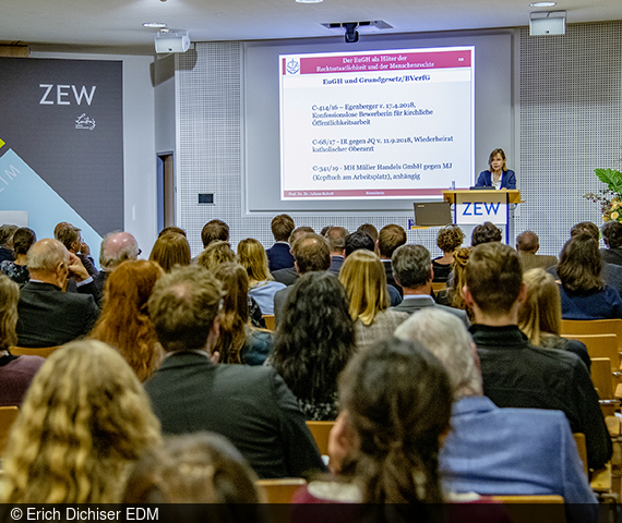 Im Dialog mit dem ZEW-Präsidenten lieferte sich Kokott einen Schlagabtausch über das Verfahren zur Ernennung von Richtern/-innen in Demokratien sowie darüber, dass Funktion und Rolle des EuGH über die reine Anwendung des Unionsrechts hinaus eine normativ geprägte Dimension erreicht. In eine ähnliche Richtung gingen die Fragen aus dem Publikum: Ist der EuGH ein Anwalt des Subsidiaritätsprinzips in Europa, vor allem mit Blick auf die aktuelle Geldpolitik? Bringt die Pflicht zur einstimmigen Entscheidung des EuGH in der Praxis Patt-Situationen mit sich? Und in welchem Verhältnis stehen EU-Grundrechtecharta und Europäische Menschenrechtskonvention? Die Diskussion darüber zeigte jedenfalls, dass diese Eisen heiß bleiben.
