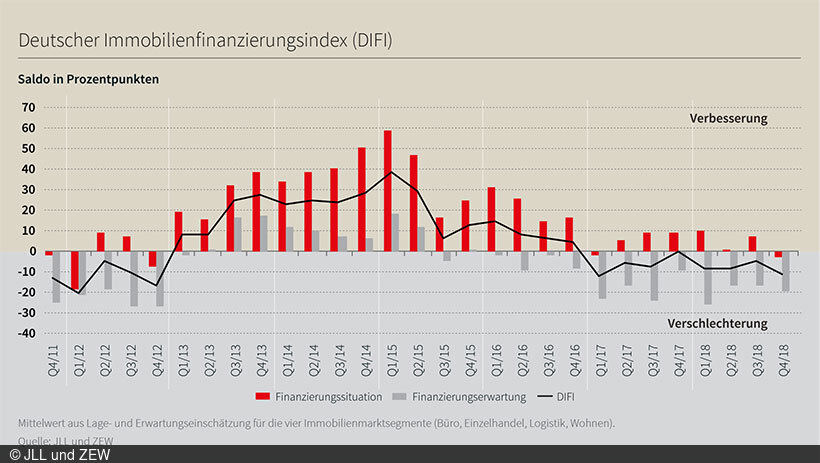 Der Deutsche Immobilienfinanzierungsindex (DIFI) bildet die Einschätzungen der aktuellen Geschäftslage (vergangene sechs Monate) und der Geschäftserwartungen (kommende sechs Monate) bezüglich der deutschen Immobilienfinanzierungsmärkte ab. Er wird quartalsweise ermittelt und berechnet sich als Mittelwert der Salden für die Immobilienmarktsegmente Büro, Einzelhandel, Logistik, Wohnen und Hotel. Die Salden für die Segmente ergeben sich aus den prozentualen positiven und negativen Antworten der Umfrageteilnehmerinnen und Umfrageteilnehmer auf die Frage nach der Lage und der Erwartung für den deutschen Immobilienfinanzierungsmarkt. Der DIFI wird in Kooperation von JLL und dem ZEW – Leibniz-Zentrum für Europäische Wirtschaftsforschung erhoben und veröffentlicht. An der Umfrage im Januar und Februar 2019 beteiligten sich 29 Expertinnen und Experten.