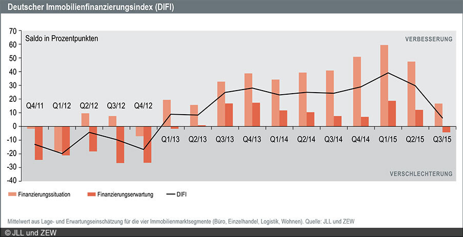 Der Deutsche Immobilienfinanzierungsindex (DIFI) bildet die Lage (vergangene sechs Monate) und die Erwartungen (kommende sechs Monate) der Umfrageteilnehmer bezüglich der deutschen Immobilienfinanzierungsmärkte ab. Er wird quartalsweise ermittelt und berechnet sich als Mittelwert der Salden für die Immobilienmarktsegmente Büro, Einzelhandel, Logistik und Wohnen. Die Salden für die Segmente ergeben sich aus den prozentualen positiven und negativen Antworten der Umfrageteilnehmer auf die Frage nach der Lage und der Finanzierungserwartung für den deutschen Immobilienmarkt. Der DIFI wird in Kooperation von Jones Lang LaSalle (JLL) und dem Zentrum für Europäische Wirtschaftsforschung (ZEW) erhoben und veröffentlicht. An der Umfrage im August 2015 beteiligten sich 46 Experten.