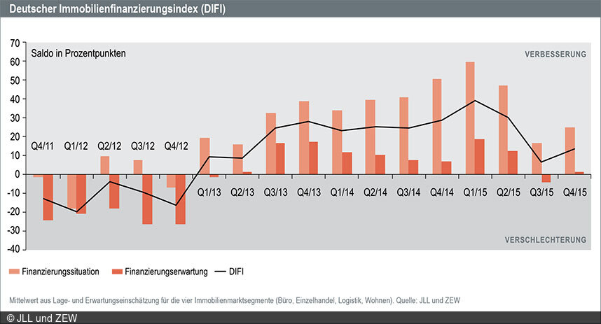Der Deutsche Immobilienfinanzierungsindex (DIFI) bildet die Lage (vergangene sechs Monate) und die Erwartungen (kommende sechs Monate) der Umfrageteilnehmer bezüglich der deutschen Immobilienfinanzierungsmärkte ab. Er wird quartalsweise ermittelt und berechnet sich als Mittelwert der Salden für die Immobilienmarktsegmente Büro, Einzelhandel, Logistik und Wohnen. Die Salden für die Segmente ergeben sich aus den prozentualen positiven und negativen Antworten der Umfrageteilnehmer auf die Frage nach der Lage und der Finanzierungserwartung für den deutschen Immobilienmarkt. Der DIFI wird in Kooperation von Jones Lang LaSalle (JLL) und dem Zentrum für Europäische Wirtschaftsforschung (ZEW) erhoben und veröffentlicht. An der Umfrage im Oktober/November 2015 beteiligten sich 48 Experten.