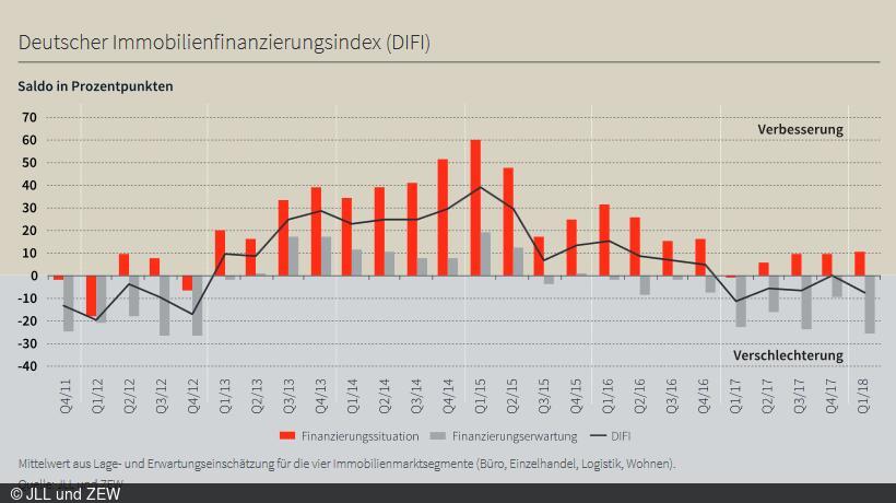 Der Deutsche Immobilienfinanzierungsindex (DIFI) bildet die Einschätzungen der aktuellen Geschäftslage (vergangene sechs Monate) und der Geschäftserwartungen (kommende sechs Monate) bezüglich der deutschen Immobilienfinanzierungsmärkte ab. Er wird quartalsweise ermittelt und berechnet sich als Mittelwert der Salden für die Immobilienmarktsegmente Büro, Einzelhandel, Logistik und Wohnen. Die Salden für die Segmente ergeben sich aus den prozentualen positiven und negativen Antworten der Umfrageteilnehmerinnen und Umfrageteilnehmer auf die Frage nach der Lage und der Erwartung für den deutschen Immobilienfinanzierungsmarkt. Der DIFI wird in Kooperation von JLL und dem Zentrum für Europäische Wirtschaftsforschung (ZEW) erhoben und veröffentlicht. An der Umfrage im Januar und Februar 2018 beteiligten sich 43 Expertinnen und Experten.