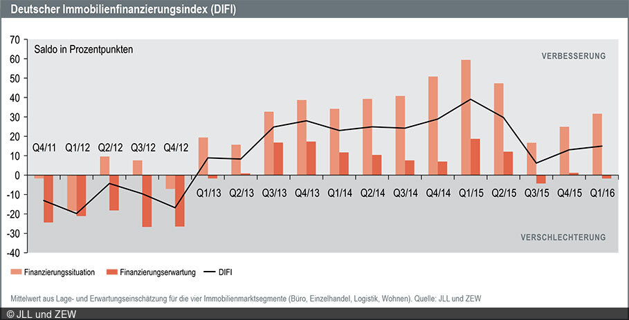 Der Deutsche Immobilienfinanzierungsindex (DIFI) bildet die Lage (vergangene sechs Monate) und die Erwartungen (kommende sechs Monate) der Umfrageteilnehmer bezüglich der deutschen Immobilienfinanzierungsmärkte ab. Er wird quartalsweise ermittelt und berechnet sich als Mittelwert der Salden für die Immobilienmarktsegmente Büro, Einzelhandel, Logistik und Wohnen. Die Salden für die Segmente ergeben sich aus den prozentualen positiven und negativen Antworten der Umfrageteilnehmer auf die Frage nach der Lage und der Finanzierungserwartung für den deutschen Immobilienmarkt. Der DIFI wird in Kooperation von Jones Lang LaSalle (JLL) und dem Zentrum für Europäische Wirtschaftsforschung (ZEW) erhoben und veröffentlicht. An der Umfrage im Januar/Februar 2016 beteiligten sich 50 Experten.