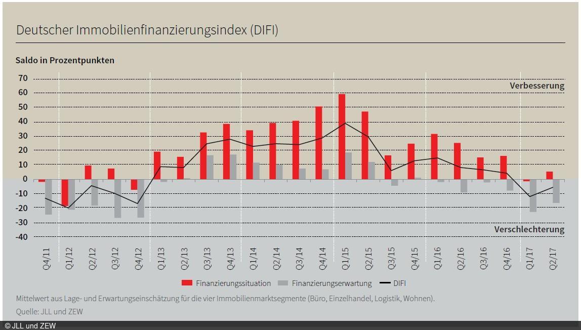 Der Deutsche Immobilienfinanzierungsindex (DIFI) bildet die Lage (vergangene sechs Monate) und die Erwartungen (kommende sechs Monate) der Teilnehmerinnen und Teilnehmer der Umfrage bezüglich der deutschen Immobilienfinanzierungsmärkte ab. Er wird quartalsweise ermittelt und berechnet sich als Mittelwert der Salden für die Immobilienmarktsegmente Büro, Einzelhandel, Logistik und Wohnen. Die Salden für die Segmente ergeben sich aus den prozentualen positiven und negativen Antworten der Umfrageteilnehmerinnen und Umfrageteilnehmer auf die Frage nach der Lage und der Finanzierungserwartung für den deutschen Immobilienmarkt. Der DIFI wird in Kooperation von Jones Lang LaSalle (JLL) und dem Zentrum für Europäische Wirtschaftsforschung (ZEW) erhoben und veröffentlicht. An der Umfrage im Mai 2017 beteiligten sich 43 Expertinnen und Experten.