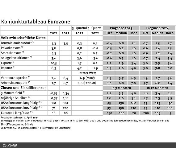 Ein Wachstum von 0,8 Prozent ist nun nicht als besonderer Höhenflug der wirtschaftlichen Entwicklung anzusehen, aber eine Rezession im Eurogebiet erscheint damit immerhin nicht mehr sehr wahrscheinlich. Für 2024 liegen die Prognosen der Expertinnen und Experten unverändert bei 1,5 Prozent. Damit sollte der Tiefpunkt der konjunkturellen Talfahrt 2023 erreicht sein, gefolgt von einem langsamen Anstieg im nächsten Jahr.