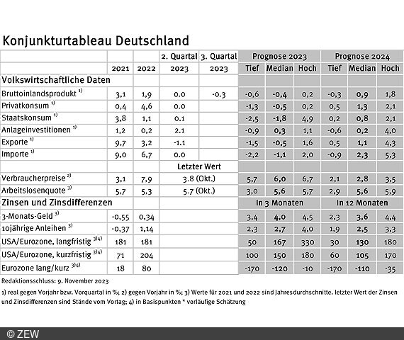 Die Quartalswachstumszahlen für das reale Bruttoinlandsprodukt (BIP) Deutschlands werden mit 0 Prozent für das zweite Quartal (unverändert gegenüber Oktober) und minus 0,3 Prozent für das dritte Quartal angegeben. Die Wachstumsprognosen für Deutschland haben sich gegenüber Oktober nicht verändert. Für das Jahr 2023 prognostizieren die Expertinnen und Experten weiterhin einen Rückgang des realen BIP in Höhe von 0,4 Prozent und für das Jahr 2024 einen Anstieg in Höhe von 0,9 Prozent.