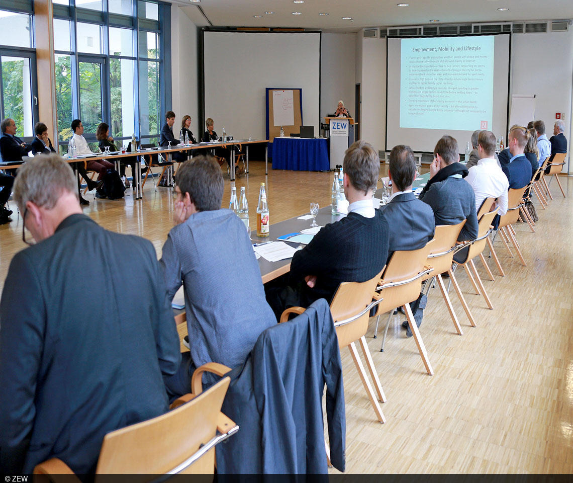 Forscherinnen und Forscher aus verschiedenen Disziplinen kamen im Rahmen der Konferenz zusammen, um aus unterschiedlichsten Perspektiven den Themenkomplex Einfamilienhaus zu diskutieren: Rund 40 Architekten/-innen, Geografen/-innen, Raum- und Stadtplaner/-innen sowie Sozial- und Wirtschaftswissenschaftler/-innen beteiligten sich rege am Diskurs in den Räumen des ZEW. Teilnehmende aus sieben europäischen Ländern präsentierten in insgesamt 16 Vorträgen Thesen und Forschungsresultate zu einer möglichst nachhaltigen Nutzung von Einfamilienhäusern und deren Bedeutung für lebenswerte Wohnquartiere, sich verändernde Anforderungen von (potenziellen) Bewohnern und Wechselwirkungen mit der gebauten Umwelt. Aus ökonomischer Perspektive wurde die zukünftige Werthaltigkeit älterer Einfamilienhäuser angesichts eines fortschreitenden bauphysisch-technischen Fortschritts und veränderter Standortpräferenzen junger Familien beleuchtet.