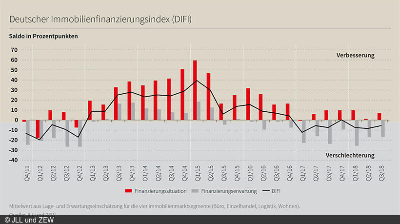 Der Deutsche Immobilienfinanzierungsindex (DIFI) von ZEW und JLL ist im dritten Quartal 2018 mit einem Plus von 3,7 Punkten gegenüber dem Vorquartal zum ersten Mal in diesem Jahr gestiegen. Damit notiert der Stimmungsindex für gewerbliche Immobilienfinanzierungen auf dem Höchststand für das Jahr 2018, auch wenn er mit minus 4,5 Punkten weiter im negativen Bereich bleibt.