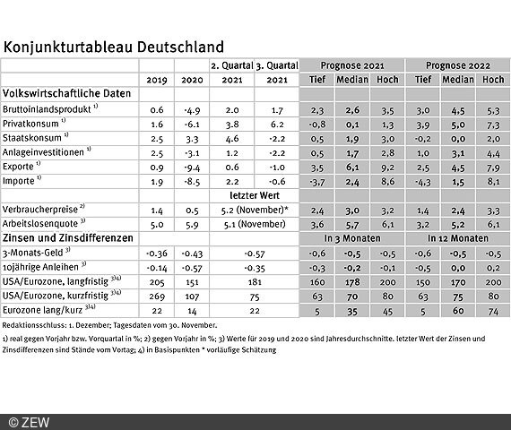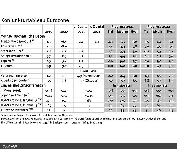 Die Wirtschaftserholung nach dem Konjunktureinbruch zu Beginn der Pandemie hat seit Jahresanfang zu einem sehr starken Anstieg der Verbraucherpreisinflation geführt. Mit 4,9 Prozent im Eurogebiet und 5,2 Prozent in Deutschland erreichen die Inflationsraten im November neue Höchstwerte. Nach wie vor gehen die Expertinnen und Experten jedoch davon aus, dass die Inflationsraten im kommenden Jahr wieder sinken werden, allerdings werden die Prognosen etwas angehoben. 2022 soll die durchschnittliche jährliche Inflationsrate im Eurogebiet bei 2,0 Prozent liegen und damit genau dem Zielwert der Europäischen Zentralbank (EZB) entsprechen. Für Deutschland wurden die Inflationsprognosen für das nächste Jahr von zuvor 2,1 Prozent auf aktuell 2,4 Prozent angehoben. Im Vergleich zu den derzeitigen Inflationsraten und auch im Vergleich zu den Durchschnittswerten für 2021 gehen die Expertinnen und Experten damit nicht nur von einer Trendwende nach unten, sondern sogar von einem sehr starken Rückgang im Verlauf des nächsten Jahres aus. Die monetären Bedingungen sollen entsprechend unverändert bleiben, eine Wende bei der Geldpolitik oder am Anleihemarkt wird – nach wie vor – nicht angenommen.