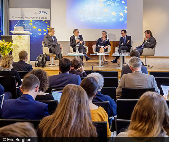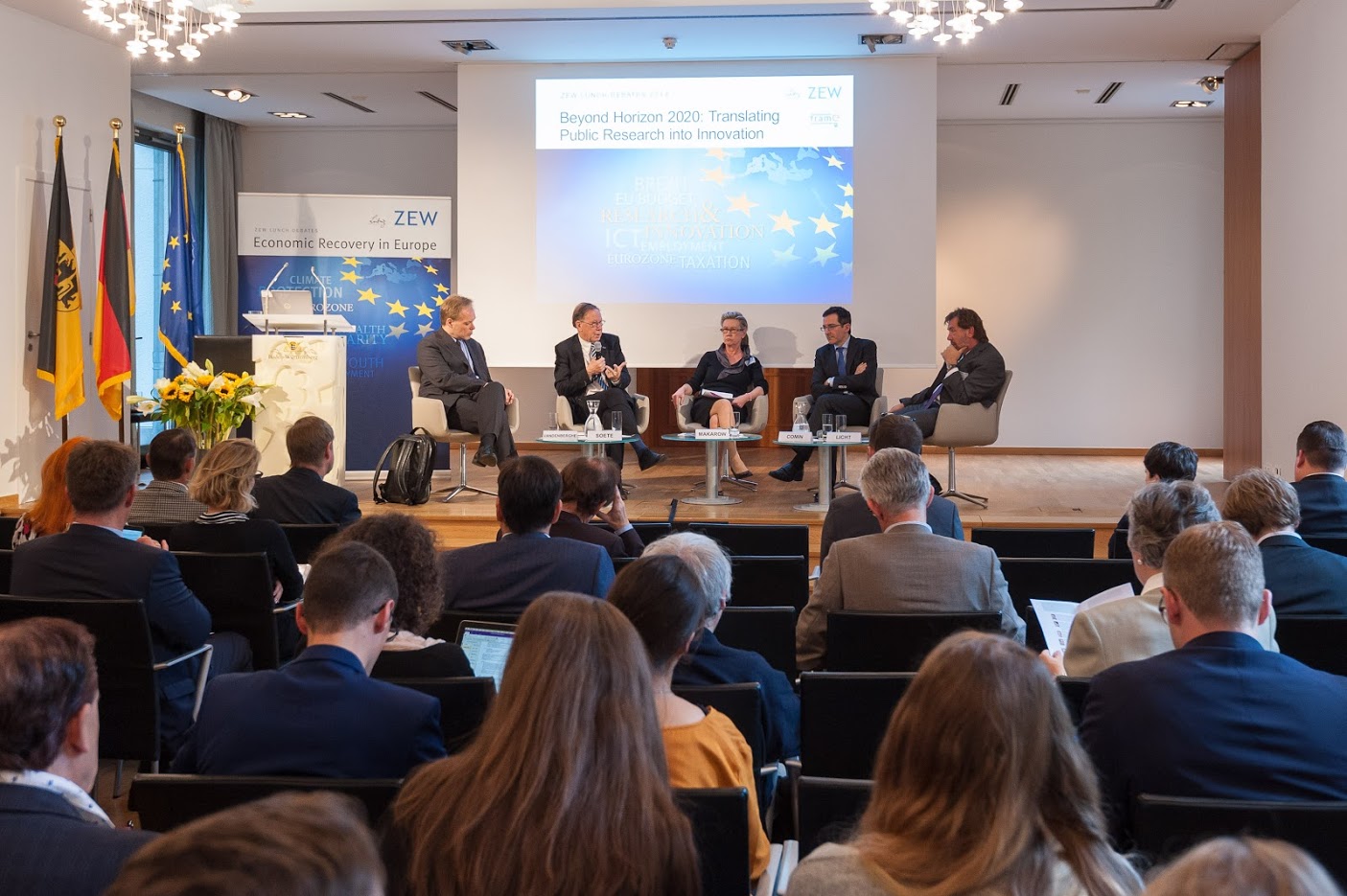 Umso willkommener war für die zahlreichen Zuhörerinnen und Zuhörer die Gelegenheit, sich mit den von Dr. Georg Licht, dem Leiter des ZEW-Forschungsbereichs „Innovationsökonomik und Unternehmensdynamik“, eingeladenen Expertinnen und Experten über die künftigen Rahmenbedingungen der EU-Forschungsförderung auszutauschen und deren Einschätzung zu ganz spezifischen Fragestellungen kennenzulernen. Die Expertinnen und Experten der Lunch Debate waren neben Georg Licht: Diego Comin, Professor für Wirtschaftswissenschaften am Dartmouth College und Research Fellow am CEPR; Professorin Marja Makarow, PhD, Direktorin des Biocenter Finland und Vizepräsidentin der Universität Helsinki; Luc Soete, Honorarprofessor der Wirtschafswissenschaften an der Universität Maastricht und Fellow der Royal Dutch Academy of Sciences; Kurt Vandenberghe, Direktor in der Generaldirektion für Forschung und Innovation der EU-Kommission.