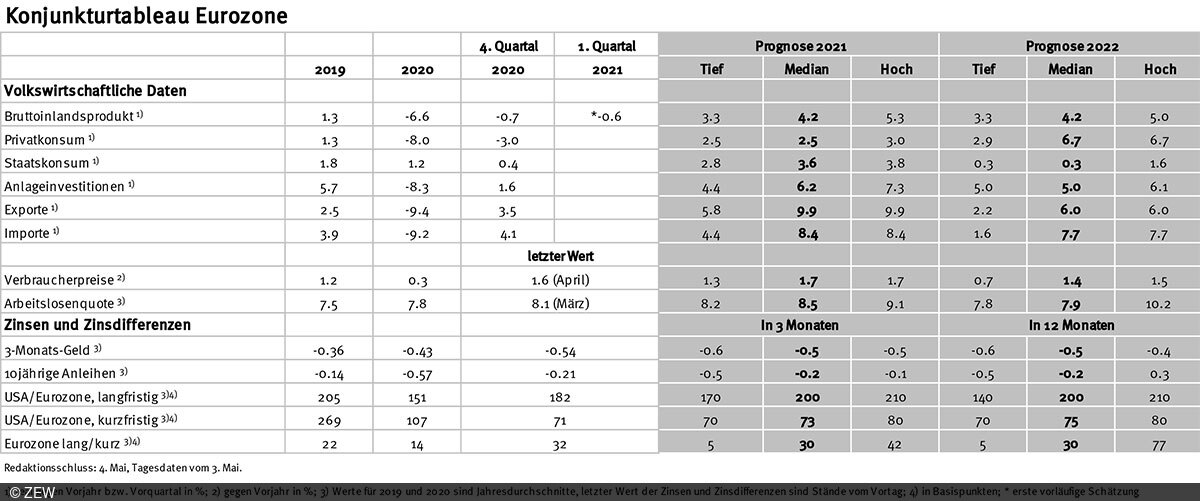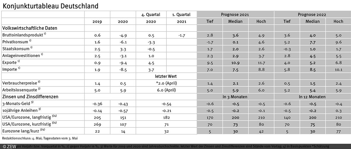 Die Expertinnen und Experten für Konjunktur zeigen sich unbeeindruckt von der erneuten Wachstumsschwäche zu Beginn des Jahres. Das zeigen die Konjunkturtableaus von ZEW und Börsenzeitung. Obwohl das Bruttoinlandsprodukt (BIP) in Deutschland im ersten Quartal 2021 im Vergleich zum Vorquartal um 1,7 Prozent zurückging, bleiben die BIP-Prognosen für 2021/22 praktisch unverändert. Für 2021 ergibt sich eine leicht höhere Prognose von 3,6 Prozent, für 2022 bleibt die Medianprognose bei 4,0 Prozent. Die Erwartung eines starken Wirtschaftswachstums wird somit nicht revidiert, sondern lediglich zeitlich verschoben.