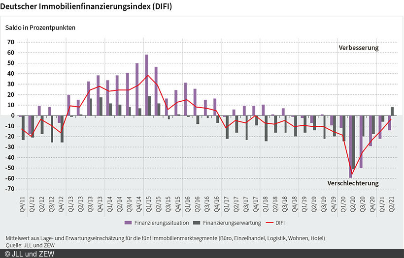 Der Deutsche Immobilienfinanzierungsindex (DIFI) bildet die Einschätzungen der aktuellen Geschäftslage (vergangene sechs Monate) und der Geschäftserwartungen (kommende sechs Monate) bezüglich der deutschen Immobilienfinanzierungsmärkte ab. Er wird quartalsweise ermittelt und berechnet sich als Mittelwert der Salden für die Immobilienmarktsegmente Büro, Einzelhandel, Logistik, Wohnen und Hotel. Die Salden für die Segmente ergeben sich aus den prozentualen positiven und negativen Antworten der Umfrageteilnehmerinnen und Umfrageteilnehmer auf die Frage nach der Lage und der Erwartung für den deutschen Immobilienfinanzierungsmarkt. Der DIFI wird in Kooperation von Jones Lang LaSalle (JLL) und dem ZEW – Leibniz-Zentrum für Europäische Wirtschaftsforschung erhoben und veröffentlicht. An der Umfrage vom 3. bis 17. Mai 2021 beteiligten sich 38 Expertinnen und Experten.