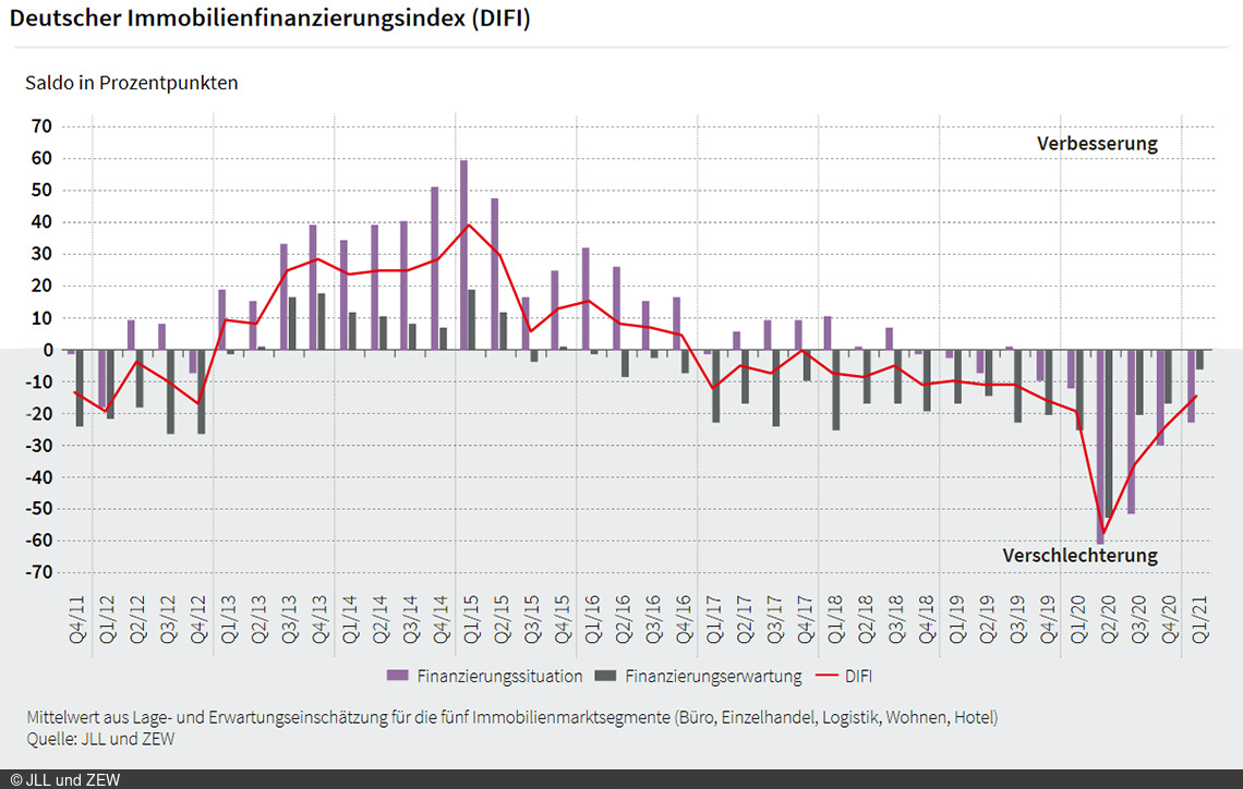 Der Deutsche Immobilienfinanzierungsindex (DIFI) bildet die Einschätzungen der aktuellen Geschäftslage (vergangene sechs Monate) und der Geschäftserwartungen (kommende sechs Monate) bezüglich der deutschen Immobilienfinanzierungsmärkte ab. Er wird quartalsweise ermittelt und berechnet sich als Mittelwert der Salden für die Immobilienmarktsegmente Büro, Einzelhandel, Logistik, Wohnen und Hotel. Die Salden für die Segmente ergeben sich aus den prozentualen positiven und negativen Antworten der Umfrageteilnehmerinnen und Umfrageteilnehmer auf die Frage nach der Lage und der Erwartung für den deutschen Immobilienfinanzierungsmarkt. Der DIFI wird in Kooperation von Jones Lang LaSalle (JLL) und dem ZEW – Leibniz-Zentrum für Europäische Wirtschaftsforschung erhoben und veröffentlicht. An der Umfrage vom 1. bis 15. Februar 2021 beteiligten sich 35 Expertinnen und Experten.