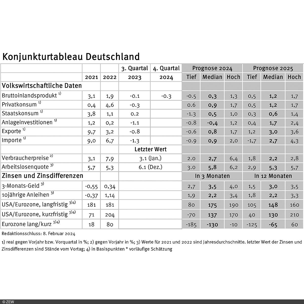 In Kooperation mit der Börsen-Zeitung veröffentlicht das ZEW seit dem Jahr 2013 monatlich Konjunkturtableaus für Deutschland und die Eurozone mit volkswirtschaftlichen Kennzahlen und Prognosen. Zahlreiche Banken und Institute veröffentlichen in unterschiedlichen Abständen Berichte über die aktuelle und voraussichtliche wirtschaftliche Lage. Aus diesen Publikationen werden die für das Tableau relevanten Informationen herausgefiltert und der Median, das Minimum und das Maximum aus den Prognosen für das jeweils laufende und dessen Folgejahr berechnet.