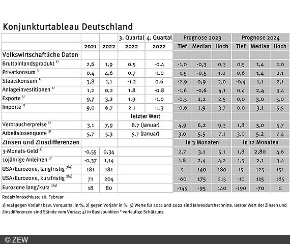 Die Expertinnen und Experten für Konjunktur zeigen sich zwar weniger pessimistisch in ihrer Wachstumsprognose für 2023, das erste Quartal wird das deutsche reale Bruttoinlandsprodukt (BIP) jedoch höchstwahrscheinlich mit technischer Rezession abschließen. Schuld daran ist vor allem der schwache private Konsum bedingt durch die hohe Inflationsrate. Dabei fallen die Prognosen für die Eurozone deutlich besser aus. Das zeigen die Konjunkturtableaus von ZEW Mannheim und Börsen-Zeitung.