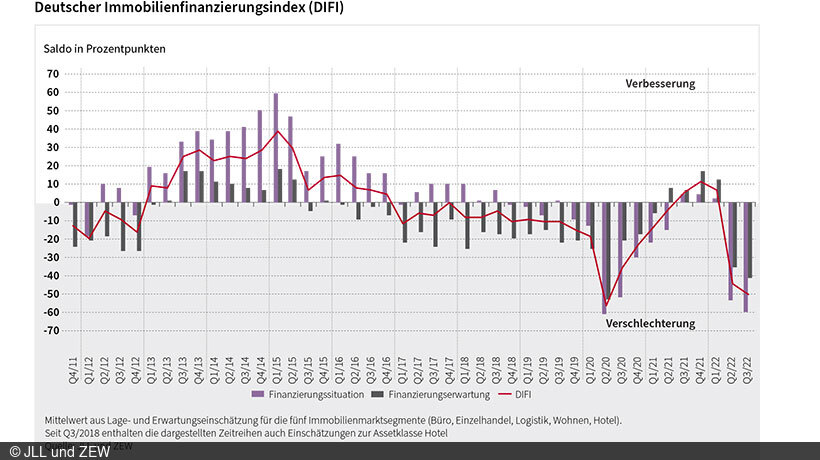 Der Deutsche Immobilienfinanzierungsindex (DIFI) bildet die Einschätzungen der aktuellen Geschäftslage (vergangene sechs Monate) und der Geschäftserwartungen (kommende sechs Monate) bezüglich der deutschen Immobilienfinanzierungsmärkte ab. Er wird quartalsweise ermittelt und berechnet sich als Mittelwert der Salden für die Immobilienmarktsegmente Büro, Einzelhandel, Logistik, Wohnen und Hotel. Die Salden für die Segmente ergeben sich aus den prozentualen positiven und negativen Antworten der Umfrageteilnehmerinnen und Umfrageteilnehmer auf die Frage nach der Lage und der Erwartung für den deutschen Immobilienfinanzierungsmarkt. Der DIFI wird in Kooperation von Jones Lang LaSalle (JLL) und dem ZEW – Leibniz-Zentrum für Europäische Wirtschaftsforschung erhoben und veröffentlicht. An der Umfrage vom 9. bis 20. Mai 2022 beteiligten sich 25 Expertinnen und Experten.