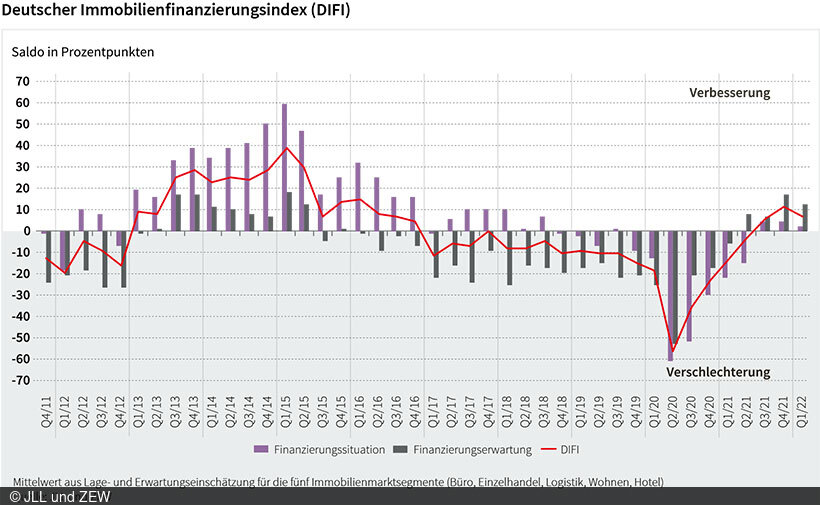 Der Deutsche Immobilienfinanzierungsindex (DIFI) bildet die Einschätzungen der aktuellen Geschäftslage (vergangene sechs Monate) und der Geschäftserwartungen (kommende sechs Monate) bezüglich der deutschen Immobilienfinanzierungsmärkte ab. Er wird quartalsweise ermittelt und berechnet sich als Mittelwert der Salden für die Immobilienmarktsegmente Büro, Einzelhandel, Logistik, Wohnen und Hotel. Die Salden für die Segmente ergeben sich aus den prozentualen positiven und negativen Antworten der Umfrageteilnehmerinnen und Umfrageteilnehmer auf die Frage nach der Lage und der Erwartung für den deutschen Immobilienfinanzierungsmarkt. Der DIFI wird in Kooperation von Jones Lang LaSalle (JLL) und dem ZEW – Leibniz-Zentrum für Europäische Wirtschaftsforschung erhoben und veröffentlicht. An der Umfrage vom 7. bis 14. Februar 2022 beteiligten sich 23 Expertinnen und Experten.