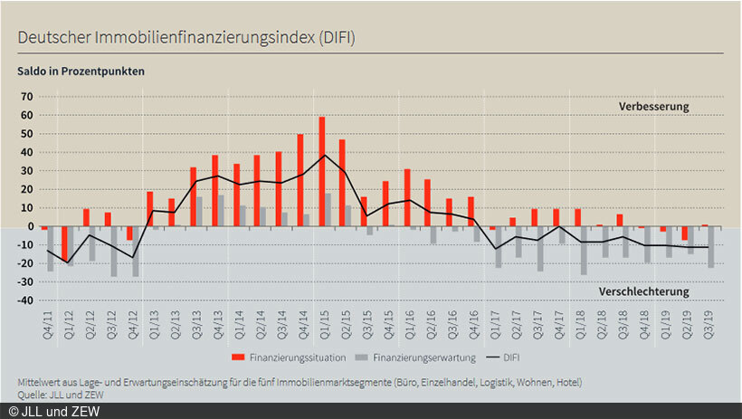 Der Deutsche Immobilienfinanzierungsindex (DIFI) bildet die Einschätzungen der aktuellen Geschäftslage (vergangene sechs Monate) und der Geschäftserwartungen (kommende sechs Monate) bezüglich der deutschen Immobilienfinanzierungsmärkte ab. Er wird quartalsweise ermittelt und berechnet sich als Mittelwert der Salden für die Immobilienmarktsegmente Büro, Einzelhandel, Logistik, Wohnen und Hotel. Die Salden für die Segmente ergeben sich aus den prozentualen positiven und negativen Antworten der Umfrageteilnehmerinnen und Umfrageteilnehmer auf die Frage nach der Lage und der Erwartung für den deutschen Immobilienfinanzierungsmarkt. Der DIFI wird in Kooperation von Jones Lang LaSalle (JLL) und dem ZEW – Leibniz-Zentrum für Europäische Wirtschaftsforschung erhoben und veröffentlicht. An der Umfrage im Mai und Juni 2019 beteiligten sich 30 Expertinnen und Experten.