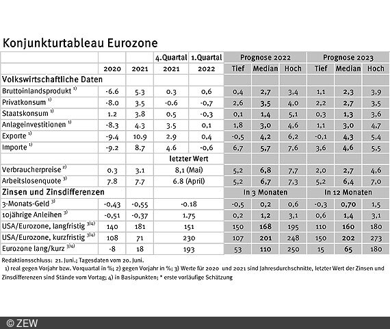 Die Expertinnen und Experten für Konjunktur prognostizieren einen weiteren Anstieg der Inflationsrate für das Eurogebiet. Es gibt außerdem Zeichen für eine positive Entwicklung des Arbeitsmarkts sowie einen allmählichen Anstieg der Prognosen für kurz- und langfristige Zinsen. Das zeigen die Konjunkturtableaus von ZEW Mannheim und Börsen-Zeitung.