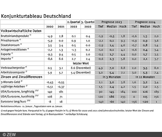 Die Expertinnen und Experten für Konjunktur sind weniger pessimistisch für das Wachstum des realen Bruttoinlandprodukts (BIP) in Deutschland und dem Eurogebiet, die Prognosen sind weniger negativ. Dabei erholt sich der Wert für das Eurogebiet etwas mehr. Das zeigen die Konjunkturtableaus von ZEW Mannheim und Börsen-Zeitung, die dort am 13. Januar 2023 erschienen sind.