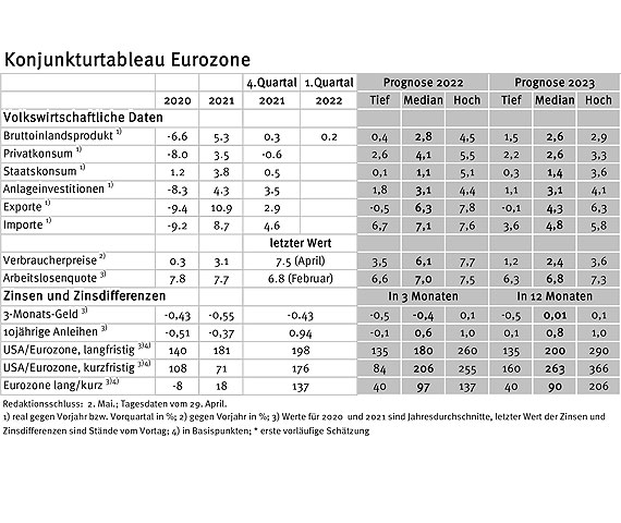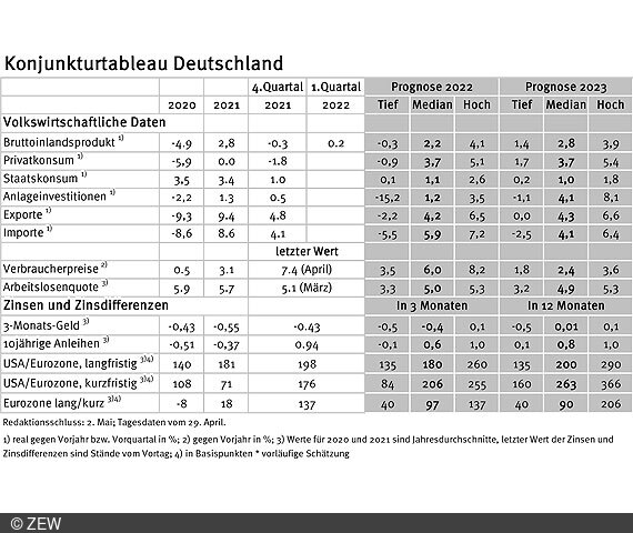 Für das Wachstum der deutschen Wirtschaft im laufenden Jahr 2022 beträgt die Median-Prognose des realen Bruttoinlandsprodukts (BIP) unverändert 2,2 Prozent, für das Jahr 2023 ist sie mit 2,8 Prozent (Vormonat: 2,7 Prozent) leicht höher als im Vormonat. Die Bandbreite der Prognosen ist allerdings beachtlich und drückt große Unsicherheit bezüglich des weiteren Verlaufs der Konjunktur in diesem Jahr aus: Die niedrigste Prognose geht mit einem Rückgang um 0,3 Prozent (relativ zum Vorjahr) von einer leichten Rezession aus, die höchste Prognose sieht mit 4,1 Prozent dagegen ein sehr kräftiges Wachstum. Für 2023 liegt diese Bandbreite der BIP-Prognosen zwischen 1,4 Prozent (Minimum) und 3,9 Prozent (Maximum).
