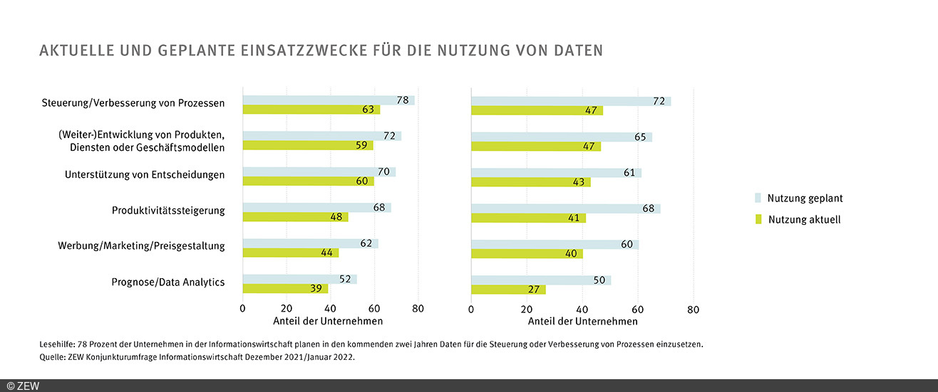 Mit einem Fokus auf Unternehmen aus der Informationswirtschaft und dem Verarbeitenden Gewerbe wird untersucht, welche Ziele mit dem Einsatz von Daten aktuell und in den kommenden zwei Jahren verfolgt werden. „Mit Unternehmensanteilen von 63 Prozent in der Informationswirtschaft und 47 Prozent im Verarbeitenden Gewerbe ist die Steuerung oder Verbesserung von Prozessen der am weitesten verbreitete Einsatzzweck für die Nutzung von Daten“, sagt Dr. Daniel Erdsiek, Wissenschaftler im ZEW-Forschungsbereich „Digitale Ökonomie“. Etwa 60 Prozent der Unternehmen in der Informationswirtschaft verwenden Daten aktuell für die Unterstützung von Entscheidungen oder die (Weiter-)Entwicklung von Produkten, Diensten, oder Geschäftsmodellen. Im Verarbeitenden Gewerbe beläuft sich dieser Anteil auf etwas weniger als die Hälfte der Unternehmen. Mit Unternehmensanteilen zwischen 40 und 48 Prozent ist darüber hinaus auch der Einsatz von Daten für Produktivitätssteigerungen sowie für Werbung, Marketing oder Preisgestaltung in vielen Unternehmen verbreitet. Unter den abgefragten Einsatzzwecken ist die Datennutzung für Prognosen bzw. Data Analytics zwar am geringsten verbreitet, aber spielt mit Anteilen von 39 Prozent in der Informationswirtschaft und 27 Prozent im Verarbeitenden Gewerbe in mehr als jedem vierten Unternehmen eine Rolle.