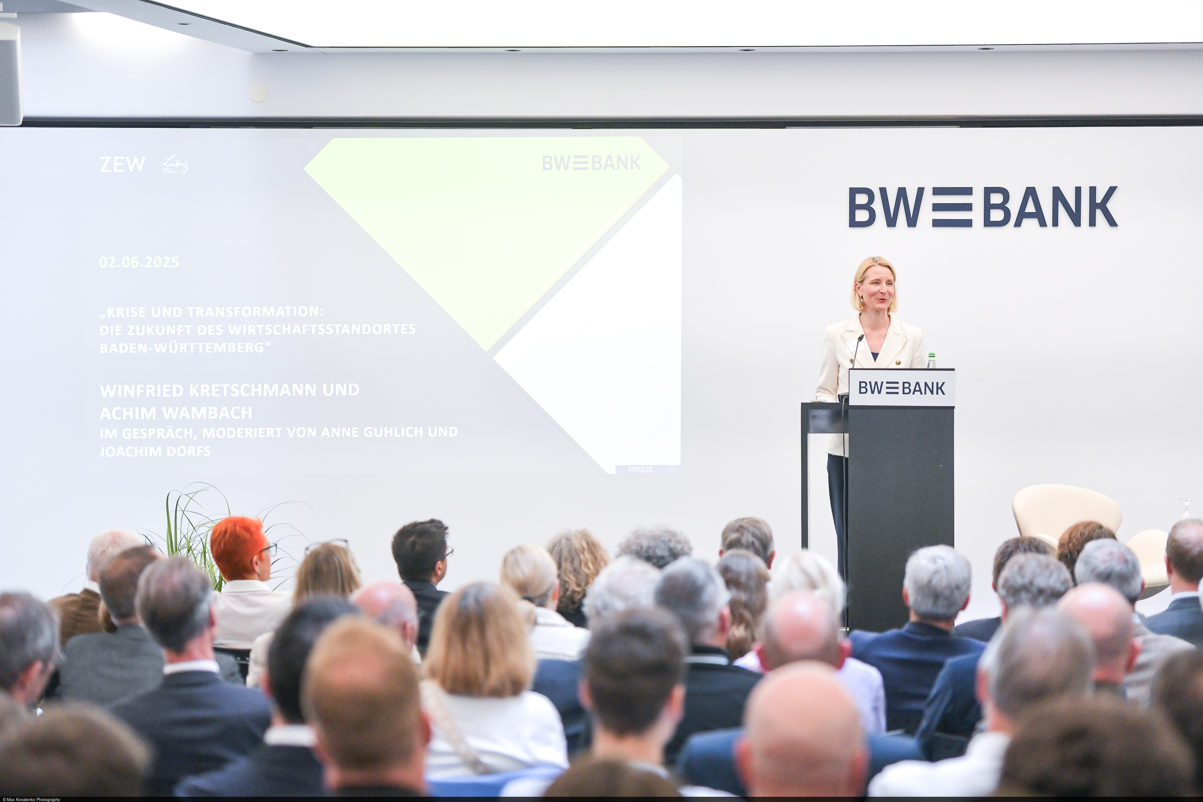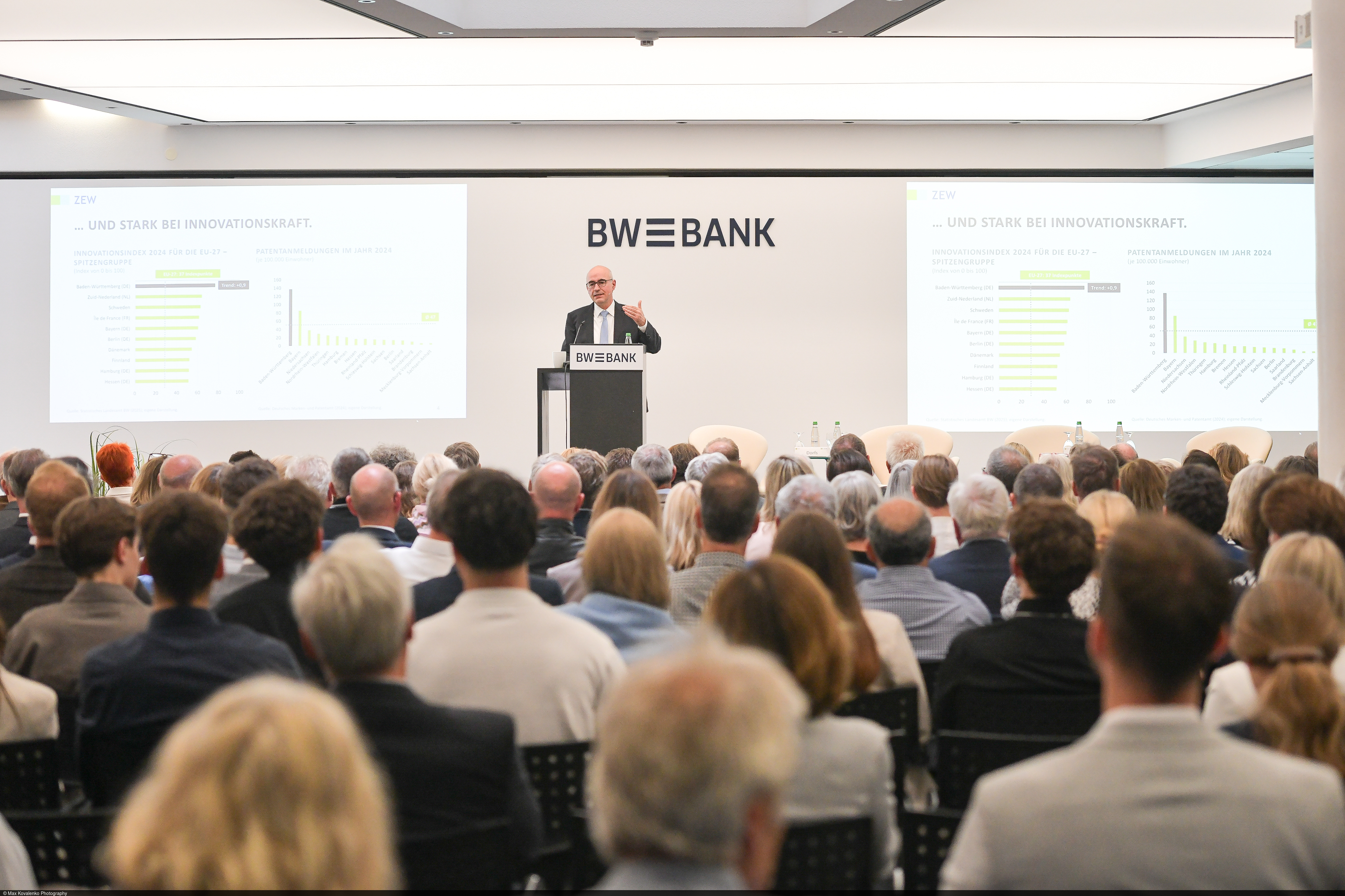 Achim Wambach stellte in seinem Impulsvortrag die aktuelle Situation der deutschen Wirtschaft vor und betonte, dass der Druck weiterhin hoch sei, vor allem auf Vorreiter-Bundesländer wie Baden-Württemberg. Auch wenn sich laut der aktuellen ZEW-Konjunkturerwartungen vom Mai 2025 die Aussicht auf die wirtschaftliche Lage Deutschlands leicht erholt habe, sei das Wirtschaftswachstum in Baden-Württemberg in den vergangenen Jahren stark gesunken und habe auch im deutschlandweiten Vergleich den stärksten BIP-Rückgang unter den Bundesländern zu verzeichnen, und das, obwohl es nach wie vor die innovationsstärkste Region in Europa sei.