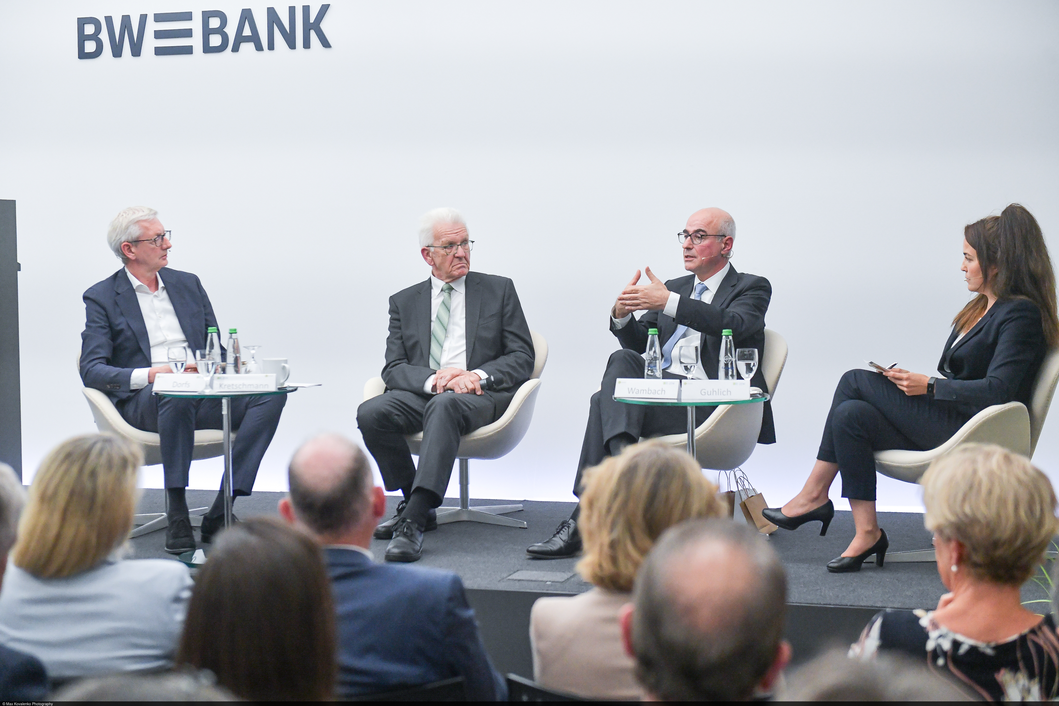 Sowohl Kretschmann als auch Wambach wiesen in der anschließenden Diskussion auf die Belastungen durch hohe Unternehmenssteuern und Bürokratieaufwände hin, die Investitionen erschwerten, die Wettbewerbsfähigkeit des Standorts schwächten und folglich den Standort Deutschland für Gründungen und Investoren unattraktiver machten. Im Hinblick auf die wirtschaftliche Resilienz betonten beide, dass die Digitalisierung, die Bekämpfung des Fachkräftemangels und neue Innovationen eine zentrale Rolle spielten.