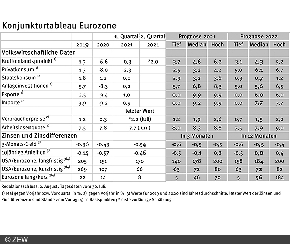Der Arbeitsmarkt im Eurogebiet hat sich erfreulich entwickelt. Im Juni liegt die Arbeitslosenquote bei 7,7 Prozent, ein Rückgang um 0,2 Prozentpunkte zum Vormonat. Die prognostizierten Werte bleiben mit 8,3 Prozent (für 2021) und 7,9 Prozent (für 2022) praktisch unverändert zu den Prognosen des Vormonats. Es ist zu vermuten, dass die Prognosen für das nächste und laufende Jahr nach unten angepasst werden, da die bisherige Entwicklung auf dem Arbeitsmarkt wesentlich günstiger verlief als gedacht. Selbst die Untergrenze der Prognosen von 7,5 Prozent für das Jahr 2022 ist mit den bereits erreichten Entwicklungen kaum noch vereinbar.