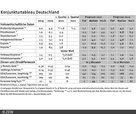 Die Prognosen der Konjunkturexperten/-innen für das Wirtschaftswachstum im Eurogebiet wurden etwas erhöht; die deutsche Wirtschaft würde den Prognosen zufolge die Corona-Krise deutlich besser überstehen als der Durchschnitt des Eurogebiets. Spannend dürfte der weitere Verlauf der Inflationsrate werden. Das zeigen die Konjunkturtableaus von ZEW Mannheim und Börsenzeitung.