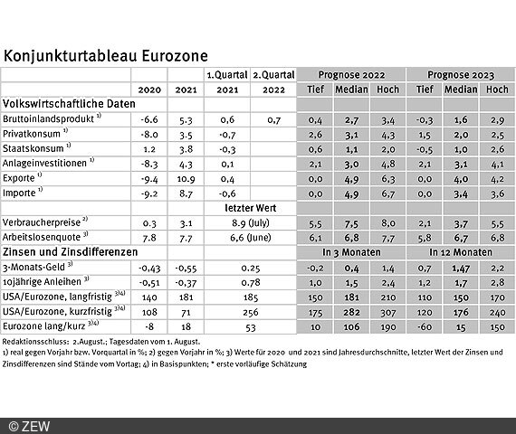 Die Expertinnen und Experten für Konjunktur erwarten ein geringeres Wirtschaftswachstum für das Eurogebiet und Deutschland als noch vor ein paar Wochen prognostiziert. Gleichzeitig wurden die Inflationsprognosen erhöht und liegen damit weit über dem Zielwert der Europäischen Zentralbank. Das zeigen die Konjunkturtableaus von ZEW Mannheim und Börsen-Zeitung.