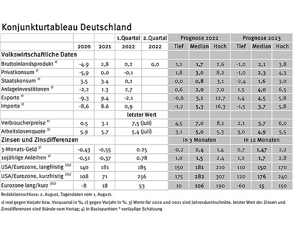 Für dieses und vor allem das nächste Jahr sind die Expertinnen und Experten weniger optimistisch als noch vor einigen Wochen. Für das Eurogebiet wurde die BIP-Prognose für 2023 von 2,3 Prozent auf 1,6 Prozent reduziert. Für die deutsche Wirtschaft sehen sie für das Jahr 2022 noch 1,7 Prozent Wachstum (zuvor: 2,1 Prozent) und für 2023 sinkt die Prognose von 2,5 Prozent auf jetzt 2,1 Prozent.