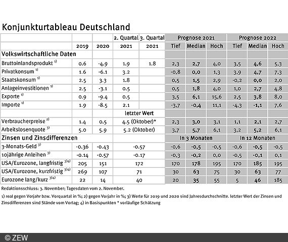 Die Expertinnen und Experten für Konjunktur erwarten eine zeitliche Verschiebung der erwarteten Wirtschaftserholung auf das Jahr 2022. Doch nicht nur das Wirtschaftswachstum in Deutschland soll 2022 ansteigen, auch die Prognosen für die Inflationsrate in Deutschland und im Eurogebiet werden leicht angehoben. Das zeigen die Konjunkturtableaus vom ZEW Mannheim und der Börsen-Zeitung.