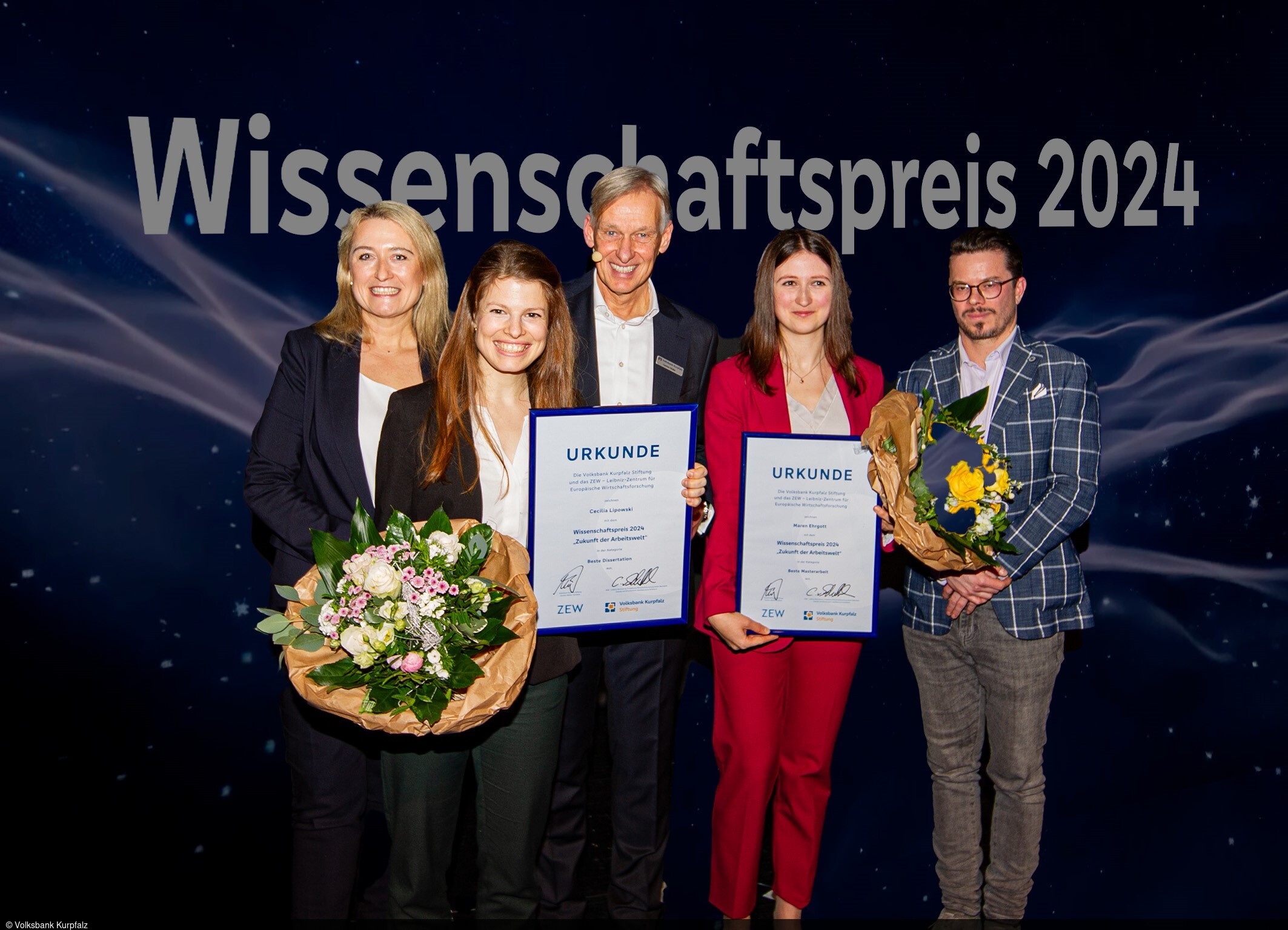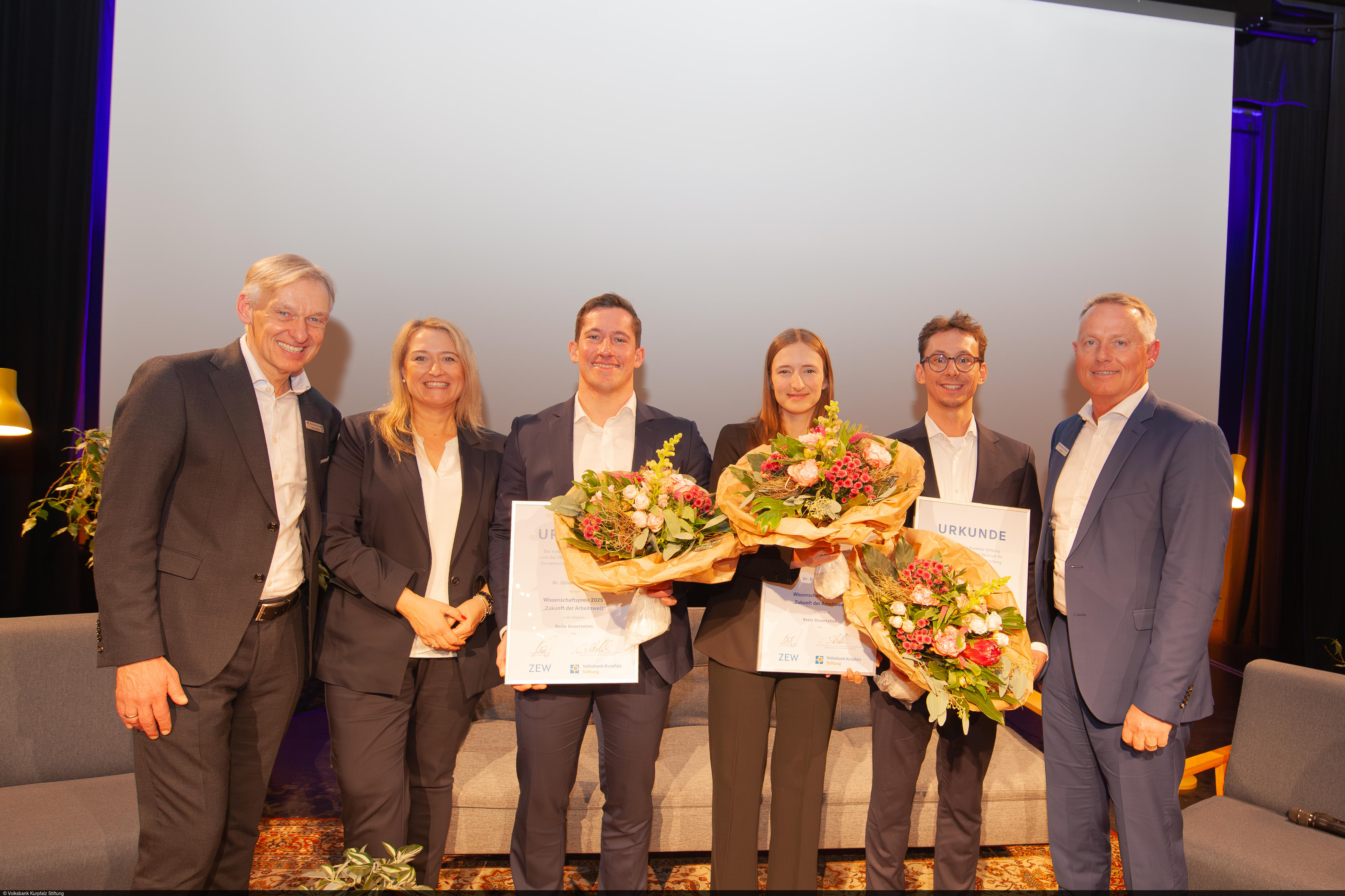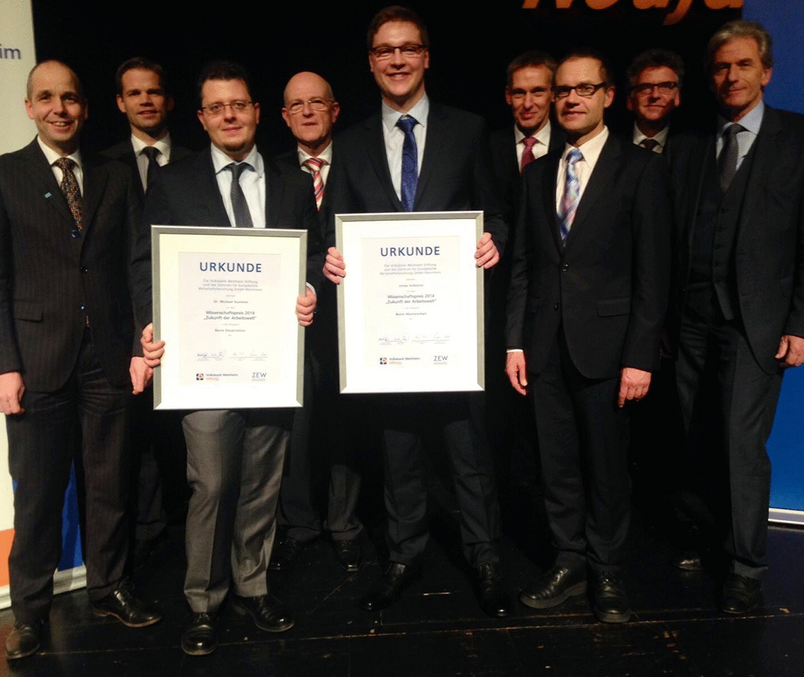 Mit dem Wissenschaftspreis „Zukunft der Arbeitswelt“ zeichnen die Volksbank Kurpfalz Stiftung und das ZEW Mannheim seit 2013 den wirtschaftswissenschaftlichen Nachwuchs der Region aus. Prämiert werden hervorragende Dissertationen und Masterarbeiten auf dem Gebiet der Wirtschaftswissenschaften, die an einer Universität oder einer außeruniversitären Forschungseinrichtung – insbesondere der Metropolregion Rhein-Neckar – angefertigt wurden. Ausschlaggebend für die Prämierung sind unter anderem die fachliche Exzellenz, die praktische Relevanz, ein starker empirischer Schwerpunkt, ein hoher Nutzwert durch eine innovative Problemlösung und die Originalität des Themas. Die Auswahl der zahlreichen Einreichungen erfolgt durch eine Jury. Der Wissenschaftspreis für die beste Dissertation ist mit 3.000 Euro dotiert, der Preis für die beste Masterarbeit mit 2.000 Euro. Beide Preise sind mit der Möglichkeit zu einem Forschungsaufenthalt am ZEW verbunden und werden jährlich in einem feierlichen Rahmen verliehen.