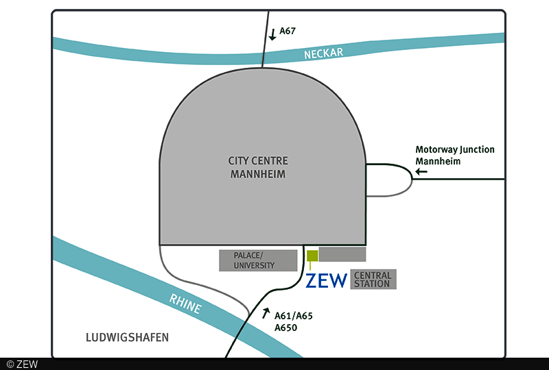 When leaving the central station, walk across the tram tracks and then turn left. Now keep straight for approx. 300 metres; you will see a modern, cream-coloured building with blue window-frames right in front of you - the ZEW-building.