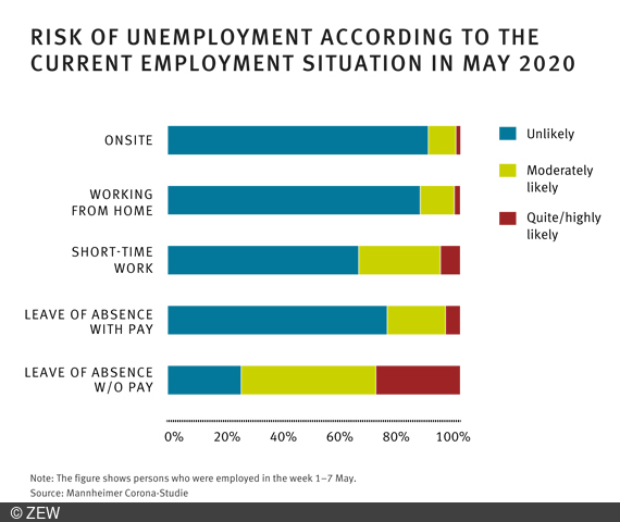 ResearchDespite the massive drop in production on account of the coronavirus pandemic in March/April 2020, the vast majority of German workers still view their own jobs as relatively secure. This sense of security, however, does not apply to employees in short-time work schemes, people on leave of absence without continued pay, and industries particularly affected by the lockdown. These are the central findings of the latest report from the “Mannheimer Corona-Studie” (“Mannheim Coronavirus Survey”) by the University of Mannheim and ZEW Mannheim, which focuses on a subjectively assessed risk of unemployment.