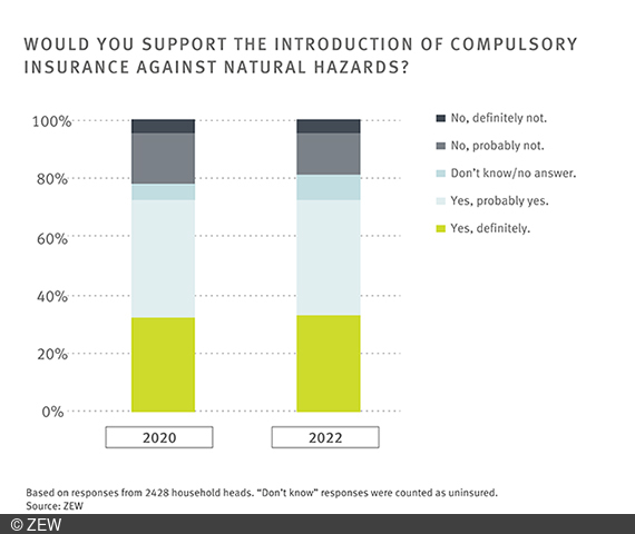 More than two thirds of German households support the introduction of mandatory insurance against flood damages and other natural hazards. Support has risen slightly following the flood disaster in 2021. This is the result of a representative survey conducted by ZEW Mannheim among around 5,000 households in 2020 and 2022.