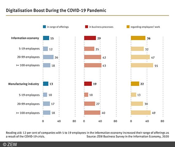 Information EconomyMany firms have made progress with regard to the digitalisation of their products and services, their business processes and the way of working over the course of the coronavirus pandemic. Around 40 per cent of companies in the business-related services sector and approximately 25 per cent of businesses in the manufacturing industry stated to have seen a surge in digitalisation. Meanwhile, the turnover of these businesses often remains – sometimes significantly – below pre-crisis levels. These are the results of a representative survey conducted by ZEW Mannheim in September 2020 among approximately 1,400 companies in the information economy and manufacturing industry.