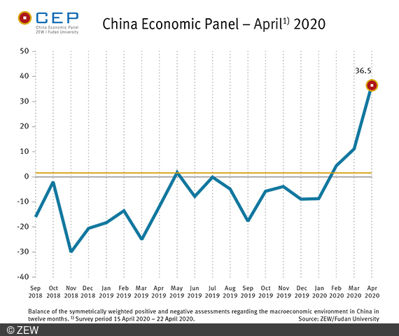 Following severe economic consequences from the coronavirus pandemic, an improvement now seems to be in sight for the People’s Republic of China, with economic expectations rising sharply in the current survey for April (15–22 April 2020). The CEP indicator, based on the China Economic Panel (CEP) and reflecting the economic expectations of international financial market experts for China on a 12-month basis, currently stands at 36.5 points, 25.4 points higher than in the previous month (11.1 points in March 2020).