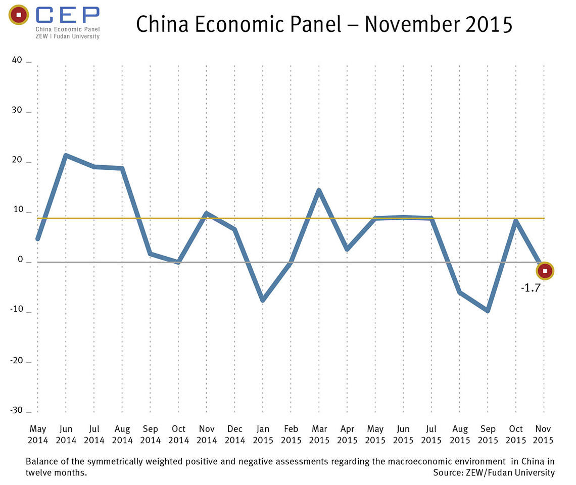 Expectations for the Chinese economy have once again considerably worsened in November 2015. The CEP Indicator, which reflects the expectations of international financial market experts regarding China’s macroeconomic development over the coming twelve months, has deteriorated in the current survey period (November 9 – 25, 2015) to a value of minus 1.7 points. On the whole, expectations for the Chinese economy show signs of increased uncertainty. This is reflected in the indicator's volatility over the last few months; in September the CEP indicator had a value of minus 9.7 points, it returned to positive territory in October, achieving a value of 8.3 points, before falling once again to minus 1.7 points in November.