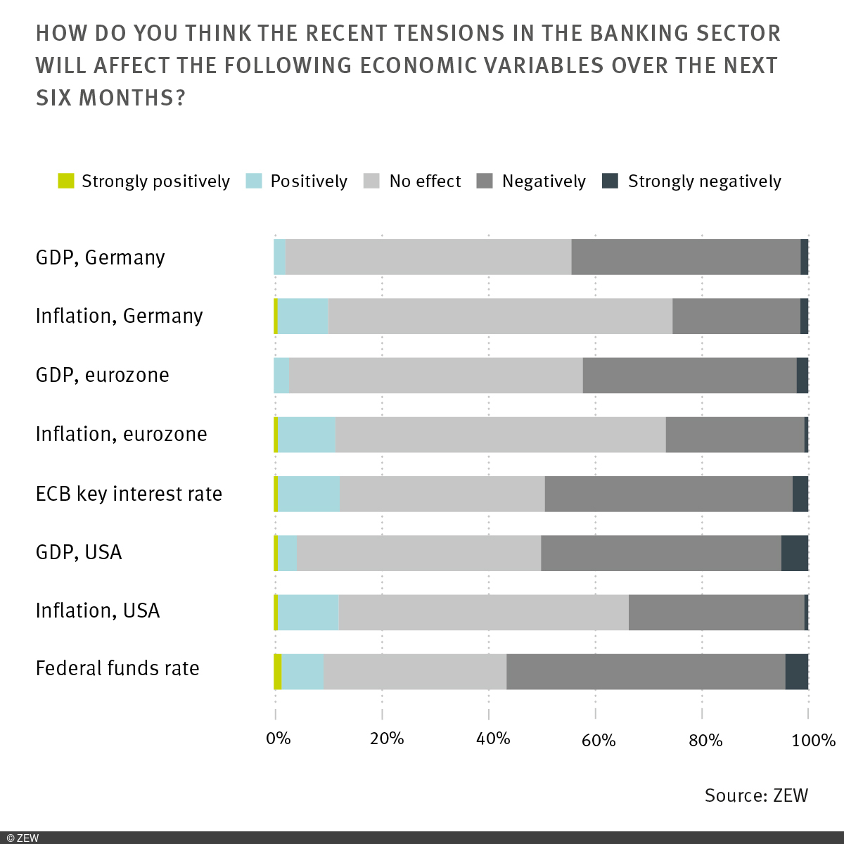“The recent tensions in the banking sector are likely to have a limited economic impact, both in terms of intensity and duration. However, they might be sufficient to make the monetary policy of the European Central Bank and the Federal Reserve slightly less aggressive in the coming months,” Thibault Cézanne, researcher in ZEW’s “Pensions and Sustainable Financial Markets” Unit, comments the result. “Many experts expect a negative impact on interest rates, but no negative impact on inflation. This possibly means that central banks may put more emphasis on financial stability than on fighting inflation in the short term following the events,” he adds.