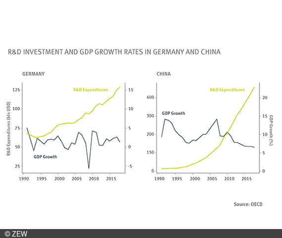 Expenditure on research and development (R&D) has increased significantly in Germany and China in recent years. The resulting output growth is, however, lower than expected in both countries. “This indicates that research productivity in both economies is too weak,” explains Dr. Philipp Boeing, senior researcher and China expert at ZEW Mannheim. In a ZEW policy brief published today, he and Paul Hünermund, PhD, assistant professor at the Copenhagen Business School, have analysed how investment in R&D is related to research productivity in Germany and China. They conclude that in order to achieve sustained growth rates in Europe, “an innovation policy is needed that takes a bottom-up approach and does not rely too heavily on mission-driven research policies. This is the only way to achieve breakthrough innovations that can compete globally with the leading industrialised countries. China’s strongly mission-driven innovation policy cannot serve as a role model in this regard.”