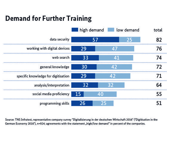 ResearchOne in two businesses in the German business economy expects job and task profiles to change as a result of the progressing digitisation in the next two years. Against this backdrop, around 67 per cent of the businesses consider further training on topics relevant for digitisation as very important or important for the company. The share of companies giving a high or very high priority to further training is particularly large in the highly digitalised ICT sector. These are the findings of the Monitoring Report DIGITAL Economy 2016, conducted by the Centre for European Economic Research (ZEW), Mannheim, in collaboration with TNS Infratest, on behalf of the Federal Ministry for Economic Affairs and Energy.