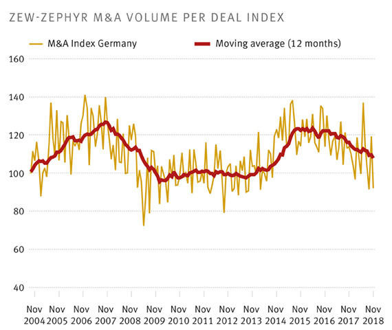M&A IndexThe number of mergers and acquisitions (M&A) completed worldwide has continued to decline. This downward trend was only briefly interrupted in June 2018, which saw the number of global acquisitions rise to a moderate 660 transactions. The volume per deal, on the other hand, has remained stable. After a brief upturn, the twelve-month moving average has continued its downward trend and now stands at 112 points – its lowest level since February 2015. These are the findings of studies carried out by the Centre for European Economic Research (ZEW), Mannheim, on the basis of the Zephyr database of Bureau van Dijk.