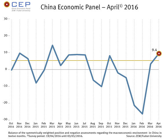 China Economic PanelExpectations regarding the development of the Chinese economy have slightly improved in the current survey period (19/04 – 03/05/2016). Rising to a level of 9.4 points, the CEP Indicator, which reflects the expectations of international financial market experts regarding China’s macroeconomic development over the coming twelve months, has exceeded its long-term average of 6.2 points for the first time in many months.