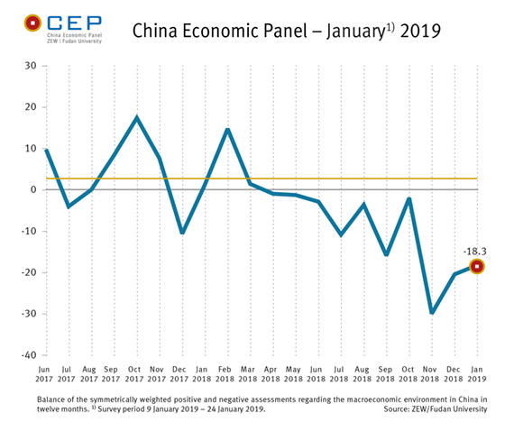 China Economic PanelIn the most recent survey for January (9–24 January 2019), expectations regarding the Chinese economy have risen by 2.2 points, to a new reading of minus 18.3 points (December 2018: minus 20.5 points). Despite the renewed increase, the indicator is still clearly in negative territory and remains well below the long-term average of 2.7 points. This sees the CEP Indicator, which reflects the expectations of international financial market experts regarding China’s macroeconomic development over the coming twelve months, pointing to a prolonged period of economic weakness.